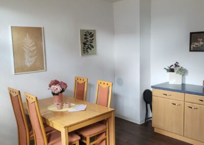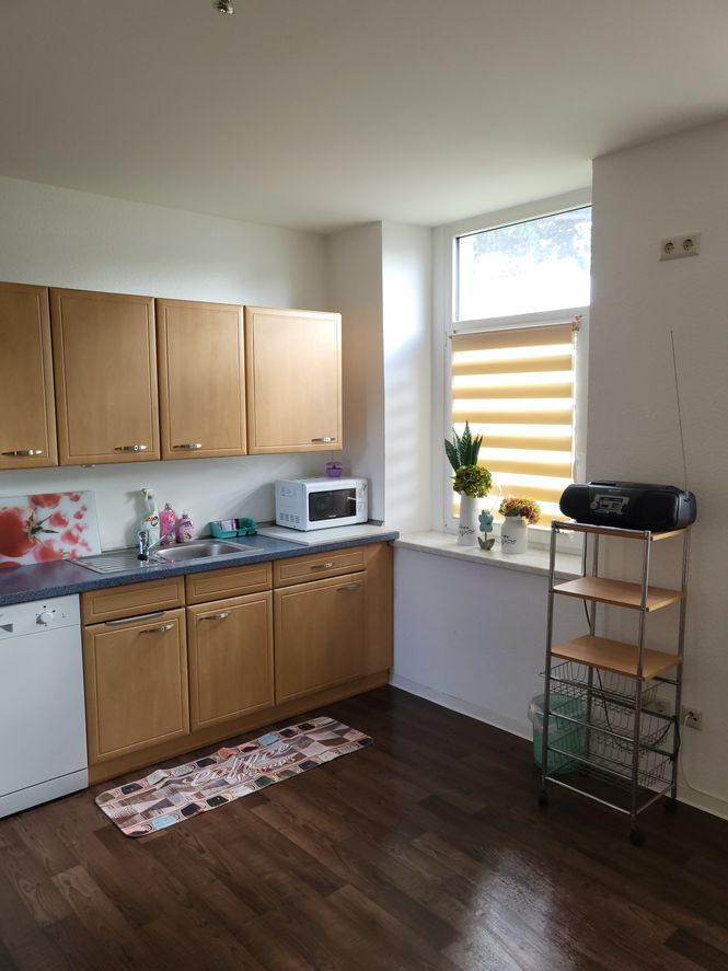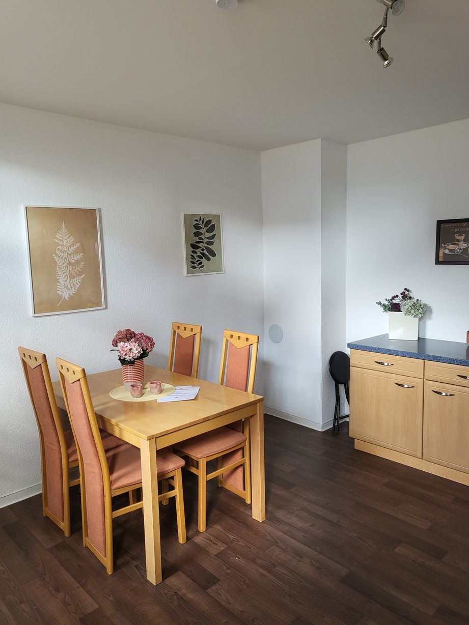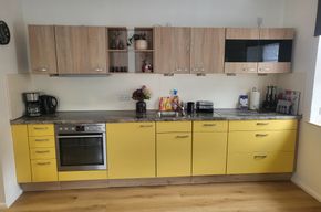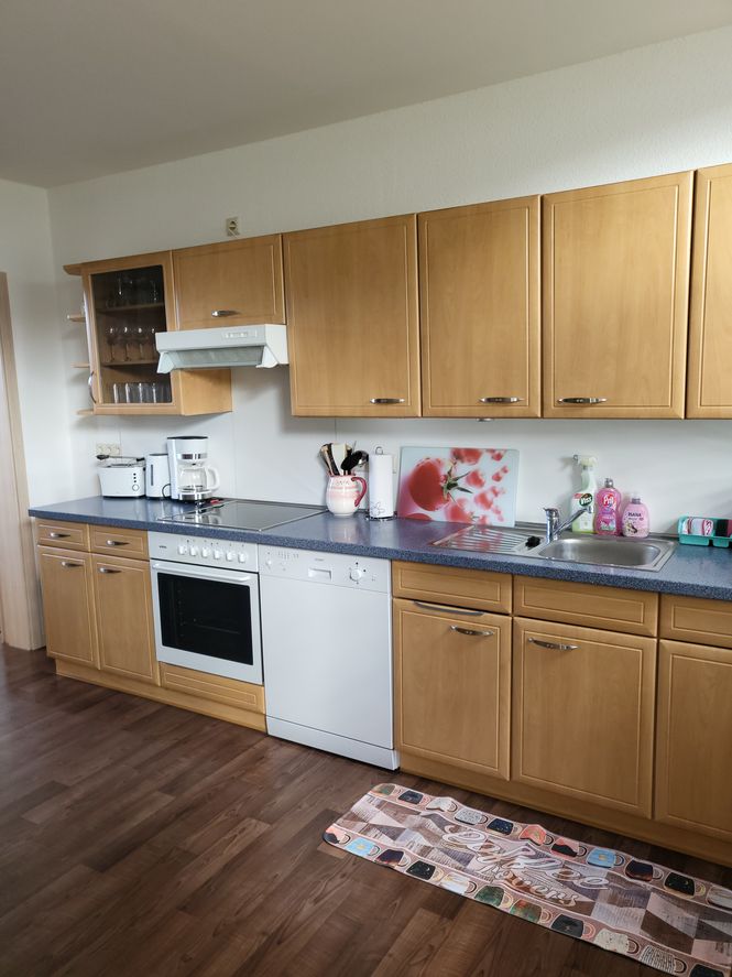 komplett ausgestattete Küchenzeile, großer Esstische mit Stühlen, großer Kühlschrank mit 3 Gefrierfächern, Herd mit Backofen, Geschirrspüler, Mikrowelle, Kochutensilien, Geschirr, Gläser, Gewürze, Kaffeemaschine inkl. Filtertüten, Wasserkocher, Toaster, Geschirrtücher, Spülmittel, Verbrauchsmittel usw., auf Wunsch Kinderhochstuhl