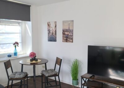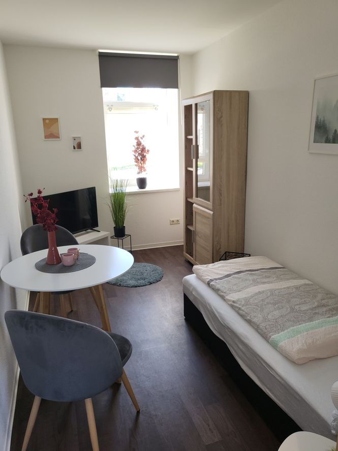 1 Bett, Esstisch mit Stühle, TV, Schrank
