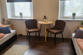 2 getrennte Betten (auch zusammen stell bar), Esstisch mit Stühle, TV, Kleiderständer