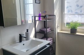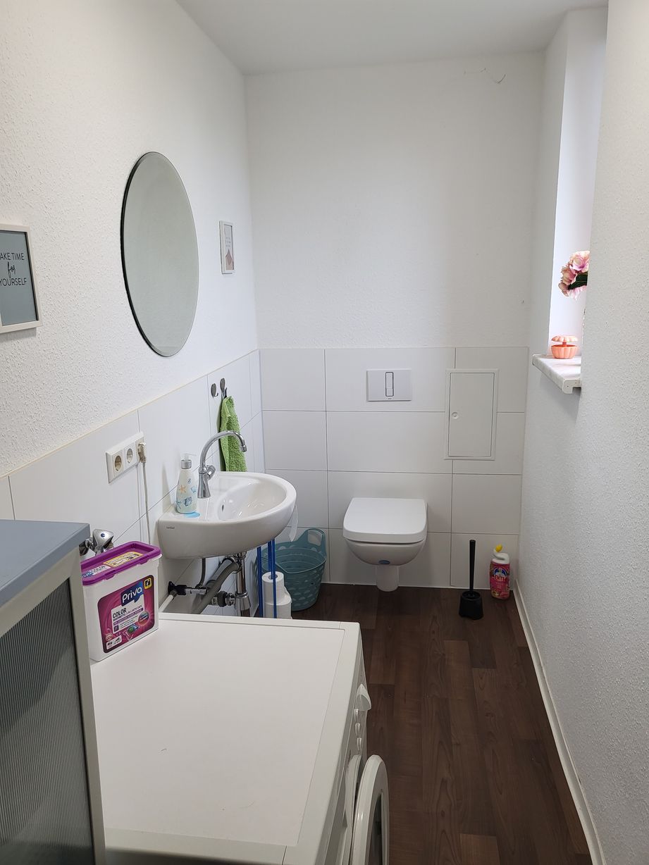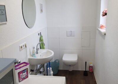WC, Waschbecken, Waschmaschine, Handtücher, Seife, Föhn